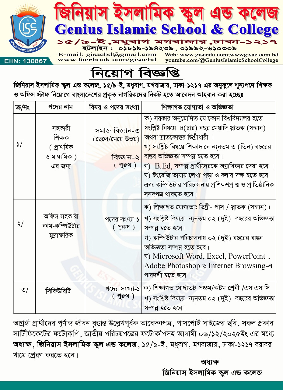 জিনিয়াস ইসলামিক স্কুল এন্ড কলেজ, ১৫/৯-ই, মধুবাগ, মগবাজার, ঢাকা-১২১৭ এর শূন্যপদে শিক্ষক ও অফিস স্টাফ নিয়োগের জন্য বাংলাদেশের প্রকৃত নাগরিকদের নিকট থেকে দরখাস্ত আহবান করা যাচ্ছে।